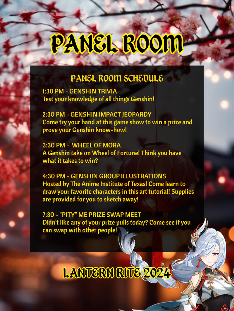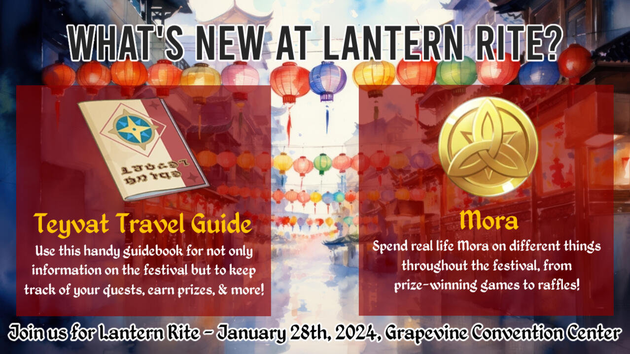 Join us for year two and participate in all manner of quests, games, activities, and more!Lantern Rite is MORE than just a convention! It is a full LARP (Live Action Roleplay) experience for the brave at heart! You can choose to participate in our side quests (and win prizes!), or you can simply enjoy the day like a regular convention. The festival is packed with vendors with Genshin Impact merchandise, a dedicated photo op room, and two activity rooms with festival games and arts and crafts!So CHOOSE YOUR OWN PATH, and come swing by Lantern Rite this year in Grapevine!